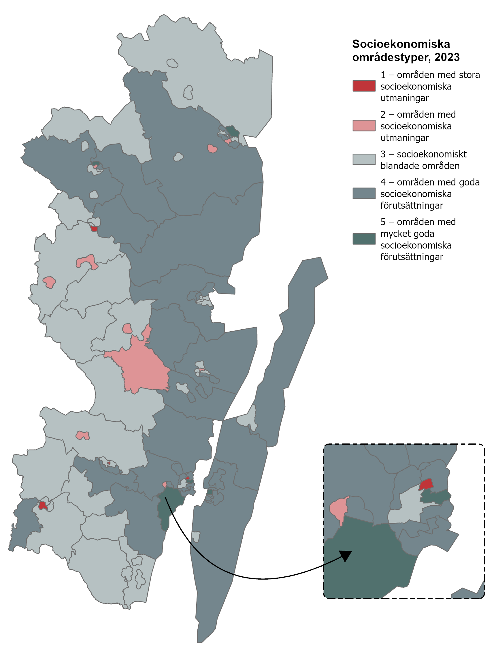 Det är allt mer ojämlika livsvillkor och ökade socioekonomiska skillnader mellan olika områden i länet och inom städer, tätorter och landsbygder. Områden med socioekonomiska utmaningar finns i hela länet, men antalet områden och storleken på dem skiljer sig åt.