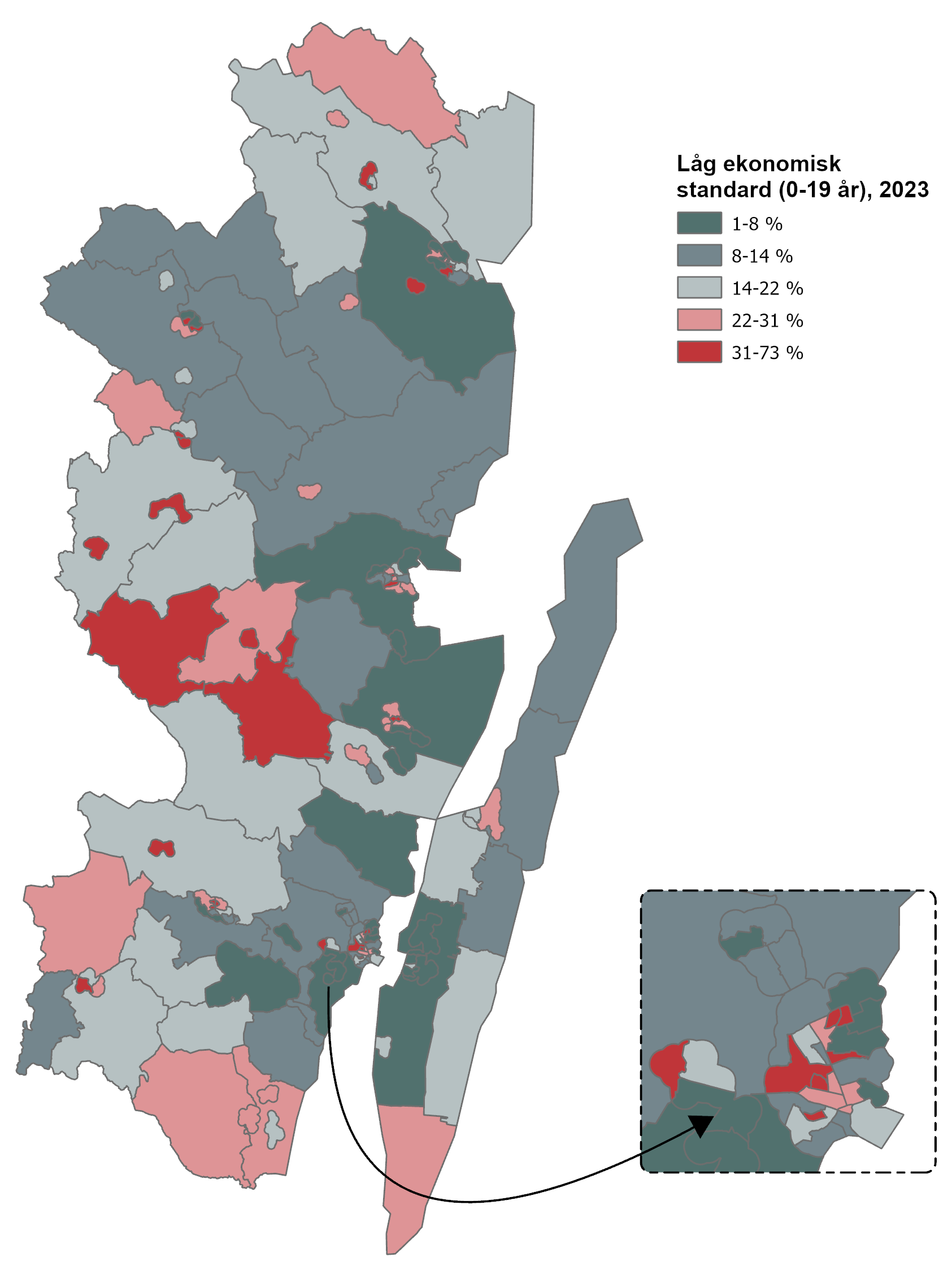Socioekonomiska förutsättningar påverkar både den psykiska och fysiska hälsan, vilket i sin tur kan påverka en mängd andra områden, som exempelvis kriminalitet och utanförskap. Det finns stora skillnader i länet när det gäller andelen barn och unga i åldrarna 0–19 som bor i hushåll med låg ekonomisk standard.