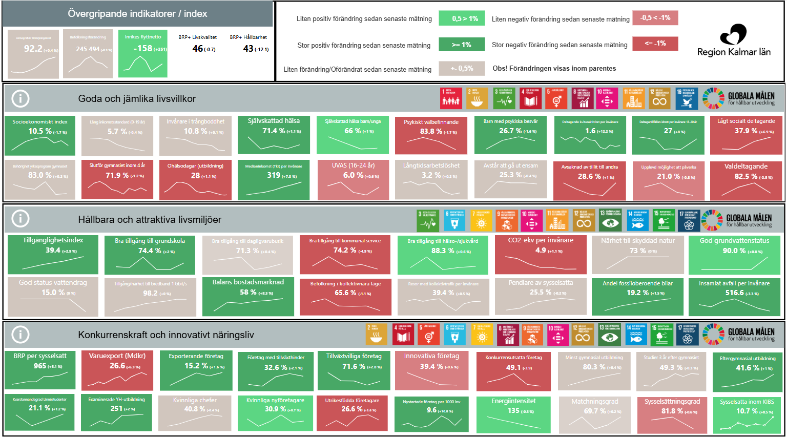 Regionala utvecklingsstrategin följs upp genom flera indikatorer inom våra tre kraftsamlingsområden. För att se om vi är på rätt väg följs dessa upp regelbundet. Här hittar du mer information om hur vi ligger till just nu.