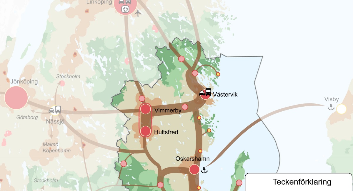 Strukturbilden beskriver de breda penseldragen och den strategiska viljan för ett flerkärnigt Kalmar län 2040, vilket betyder att sydöstra Sverige knyts samman av en mångfald av olika landsbygder, tätorter och städer.